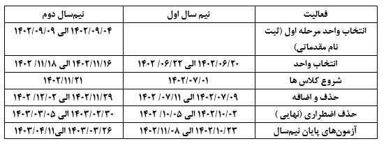 الف) در اجرای ماده ۱۳ آیین نامه یکپارچه، تقویم آموزشی سال تحصیلی 1403-1402 دانشگاه هرمزگان به شرح جدول زیر تعیین گردید: