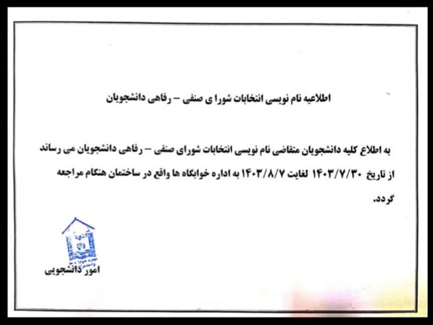 آغاز نام نویسی انتخابات شورای صنفی-رفاهی دانشجویان از تاریخ 1403/07/30 لغایت 1403/08/07