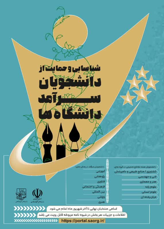 فراخـــــــــوان 🔻ثبت‌نام دومین دوره شناسایی و حمایت از دانشجویان سرآمد دانشگاه‌ها آغاز شد 🔹از کلیه دانشجویان واجد شرایط دعوت می‌شود ضمن مطالعه دقیق آئین نامه و شیوه نامه شناسایی و حمایت از دانشجویان سرآمد دانشگاه‌ها مصوبه وزارت علوم،تحقیقات و فناوری، از یکم اردیبهشت ماه تا 20 اردیبهشت ماه 1404 با مراجعه به سامانه جامع امور دانشجویان (سجاد) و یا آدرس اینترنتی https://portal.saorg.ir با تکمیل نمودن فرآیند ثبت نام، در جشنواره شرکت نمایند.