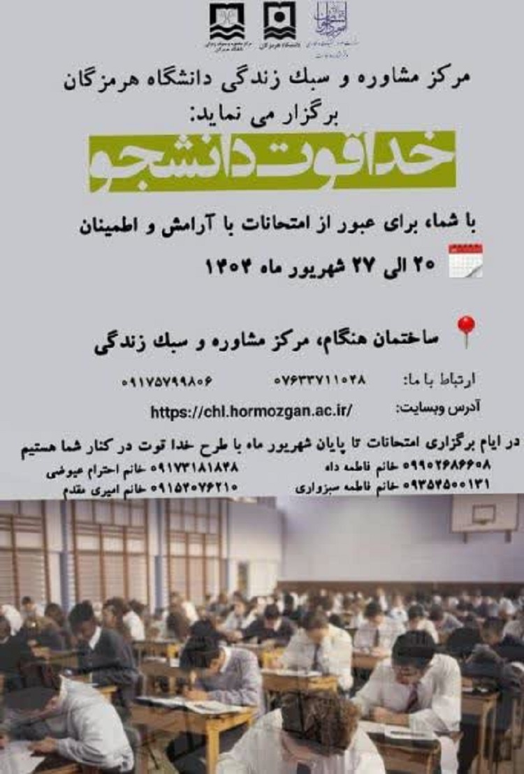 آدرس وب سايت مركز مشاوره دانشگاه هرمزگان: https://chl.hormozgan.ac.ir/ در أيام برگزاري امتحانات تا پايان شهريور ماه با طرح خدا قوت در كنار شما هستيم .
