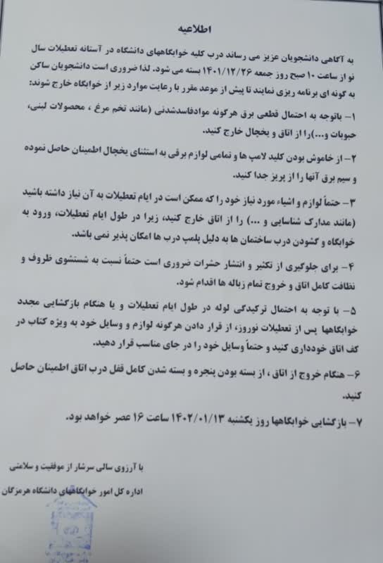 قابل توجه کلیه دانشجویان ساکن در خوابگاه ها