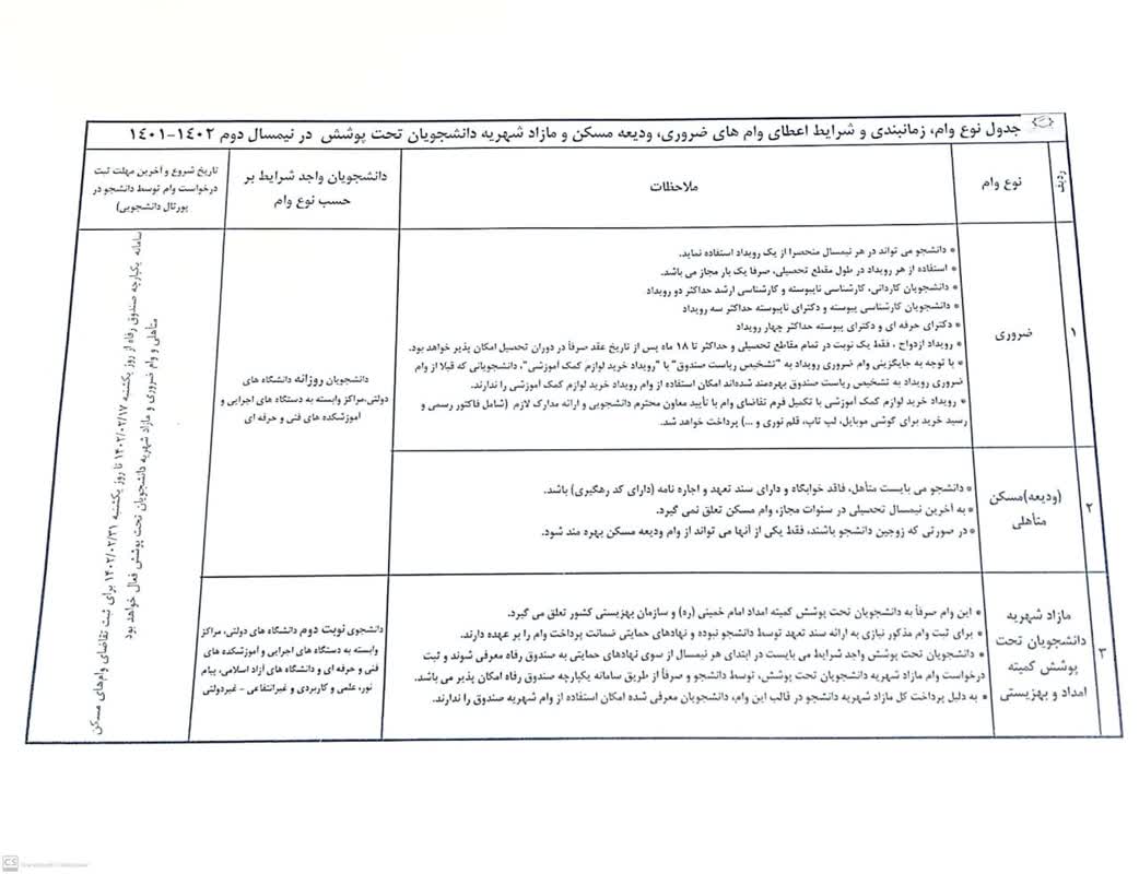جدول نوع وام، زمانبندی وام های ضروری، ودیعه مسکن و مازاد شهریه دانشجویان تحت پوشش در نیمسال دوم1402-1401