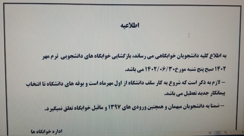 اطلاعیه بازگشایی خوابگاه ها در ترم مهرماه 1402