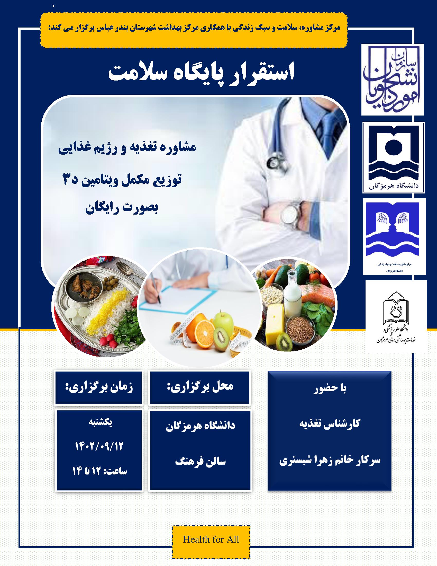 مرکز مشاوره،سلامت و سبک زندگی با همکاری مرکز بهداشت شهرستان بندرعباس برگزار می کند.