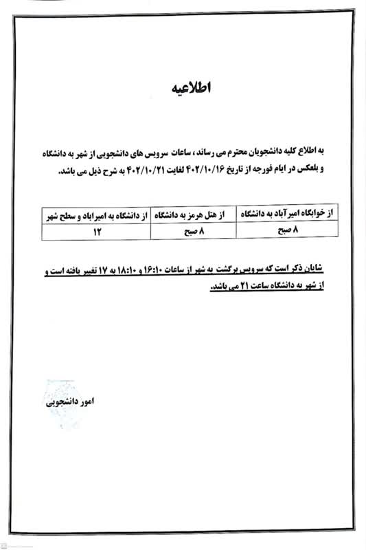 برنامه ساعات حرکت سرویس های دانشجویی در ایام فورجه ها