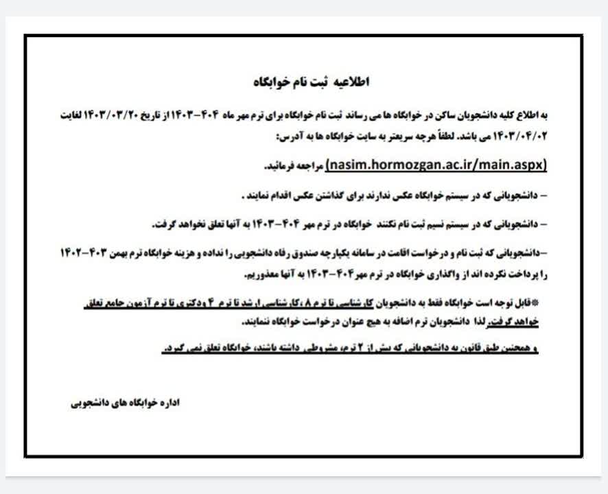 قابل توجه کلیه دانشجویان ساکن در خوابگاه ها