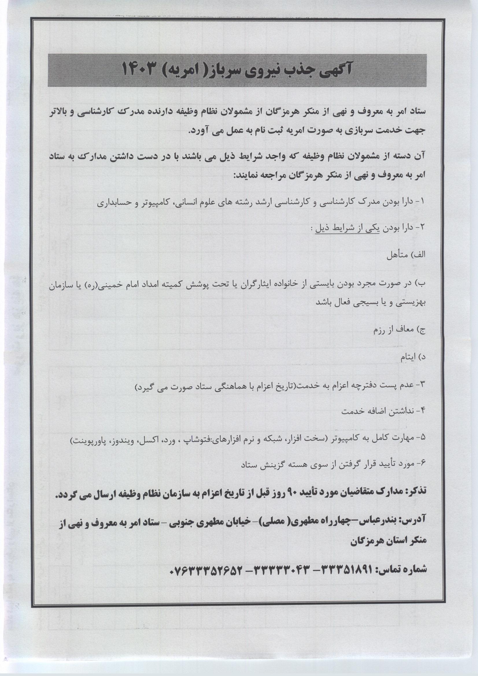 ستاد امر به معروف و نهی از منکر هرمزگان جهت خدمت سربازی به صورت امریه ثبت نام به عمل می آورد.