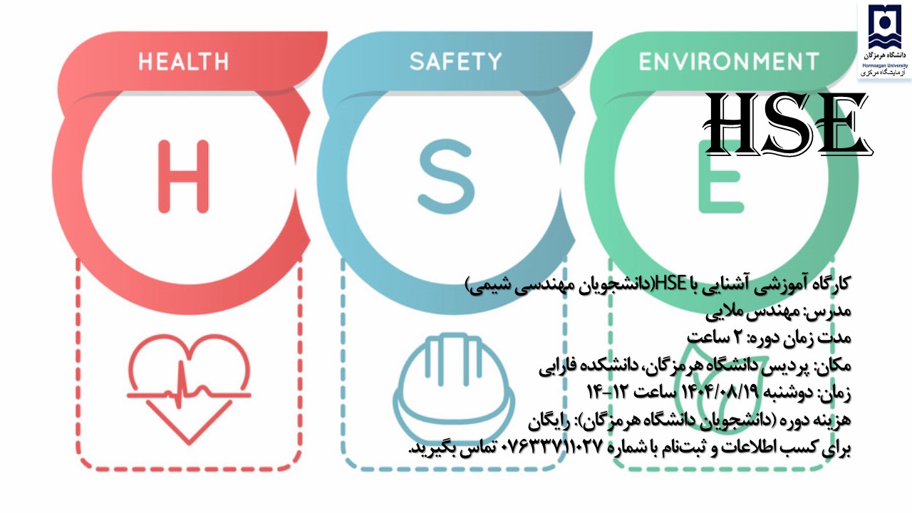 به اطلاع دانشجویان گرامی می‌رساند، آزمایشگاه مرکزی دانشگاه در راستای ارتقای سطح آگاهی و ایمنی در محیط‌های آزمایشگاهی، دوره آموزشی "ایمنی در آزمایشگاه (HSE)" را ویژه دانشجویان جدیدالورود برگزار می‌کند.
