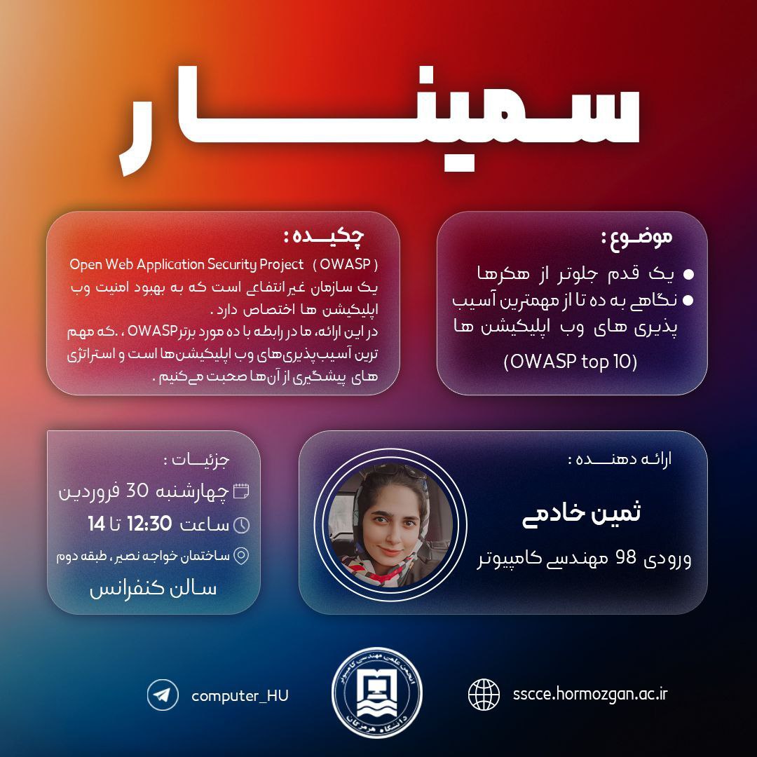 در این ارائه، ما در رابطه با ده مورد برتر OWASP، که مهم‌ترین آسیب‌پذیری‌های وب اپلیکیشن‌ها است و استراتژی‌های پیشگیری از آن‌ها صحبت می‌کنیم.