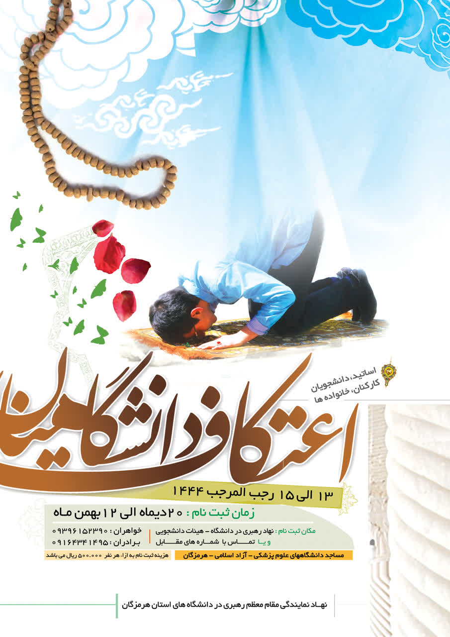مراسم معنوی اعتکاف ویژه دانشجویان، اساتید، کارکنان و خانواده محترم اساتید و کارکنان از 13 تا 15 رجب المرجب 1444 (مصادف با 15 تا 17 بهمنماه 1401) در مساجد دانشگاههای استان هرمزگان برگزار میشود.
