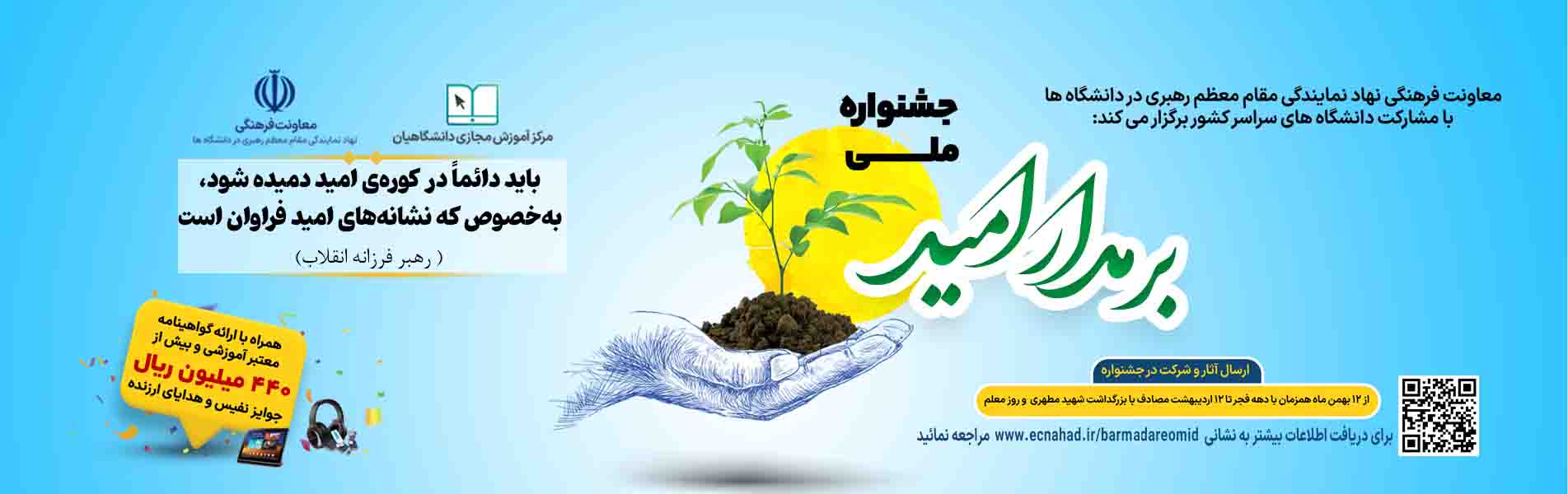 جشنواره فرهنگي- آموزشي بر مدار امید از 12 بهمن ماه 1401 لغایت 12 اردیبهشت ماه 1402 با هدف معرفی دستاوردهای انقلاب اسلامی در دو بخش "آموزش مجازی و نشست‌هاي تعاملي" و "تولید محتوای آموزشی - رسانه ای" در حال برگزاری است. مخاطبان اصلي این جشنواره، خانواده‌ بزرگ دانشگاهيان به ویژه دانشجویان، استادان و کارکنان دانشگاه‌های سراسر کشور هستند. علاقمندان ‌می‌توانند جهت کسب ‌اطلاعات‌ بیشتر و‌ شرکت در این طرح ملی ‌به ‌سامانه آموزش ‌مجازی ‌دانشگاهیان به نشانی https://ecnahad.ir/barmadareomid مراجعه نمایند.