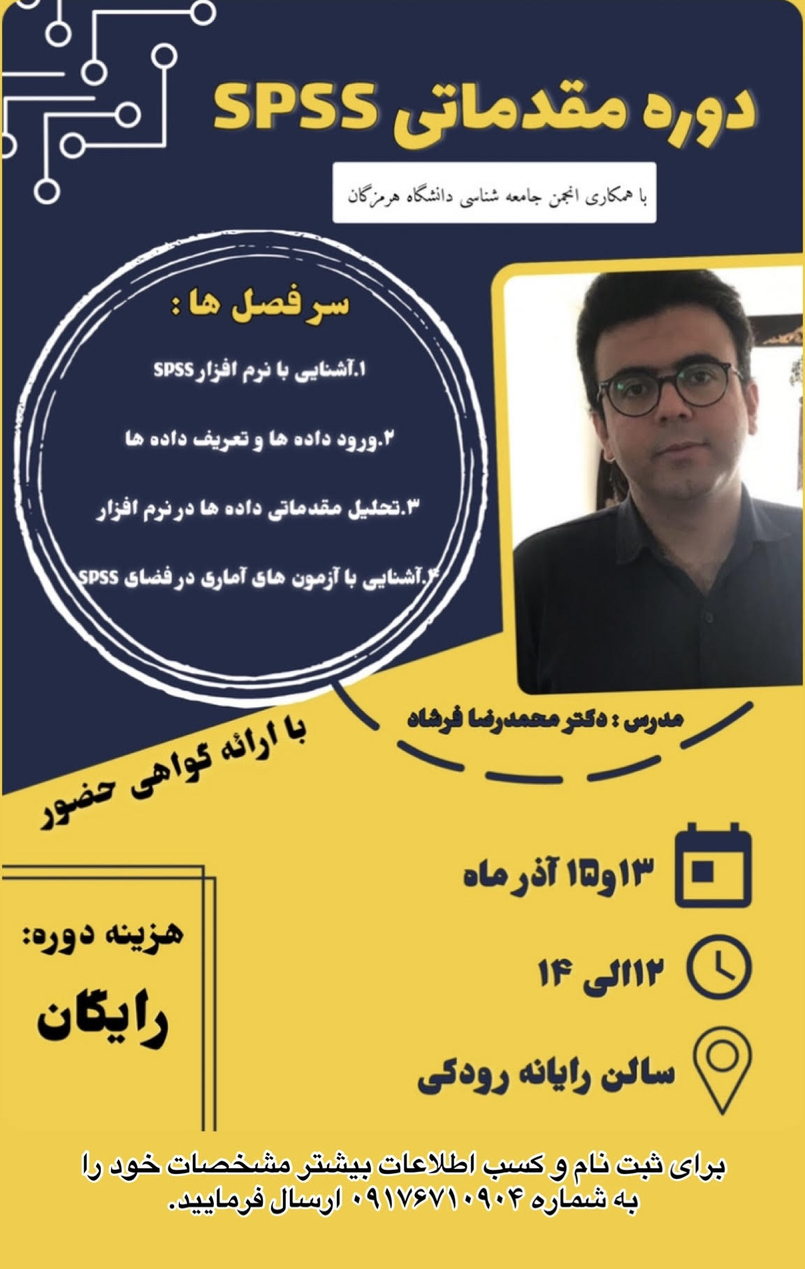 به مناسبت هفته پژوهش کارگاه دوره مقدماتی SPSS توسط انجمن علمی جامعه شناسی دانشکده علوم انسانی به تاریخ های 1401/09/13 (یکشنبه) و 1401/09/15 (سه شنبه) برگزار می گردد. اطلاعات بیشتر در پوستر درج شده است. جهت اطلاع رسانی اخبار و اطلاعات دانشکده علوم انسانی سایت دانشکده به آدرس /https://www.hormozgan.ac.ir/home/index/3/7 لطفاً انتشار فرمایید.