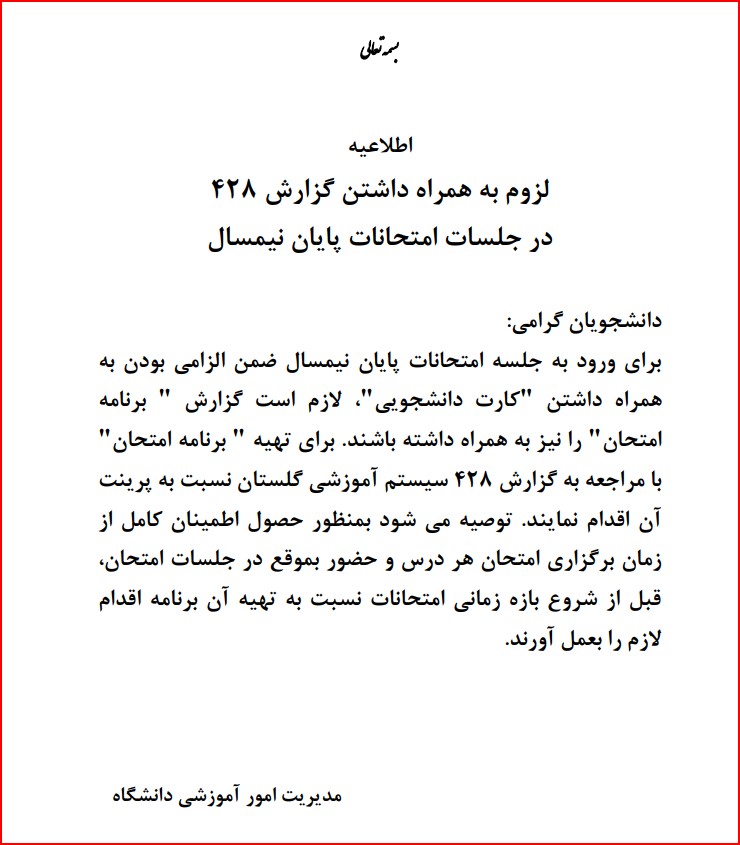لزوم همراه داشتن گزارش 428 برای امتحانات پایان نیمسال 4011