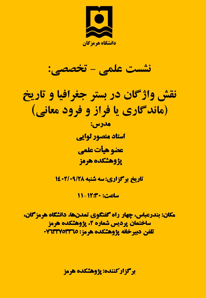 نشست علمی - تخصصی نقش واژگان در بستر جغرافیا و تاریخ (ماندگاری یا فراز و فرود معانی) روز سه شنبه مورخ 28 آذر 1402 در پژوهشکده هرمز دانشگاه هرمزگان برگزار می‌گردد.