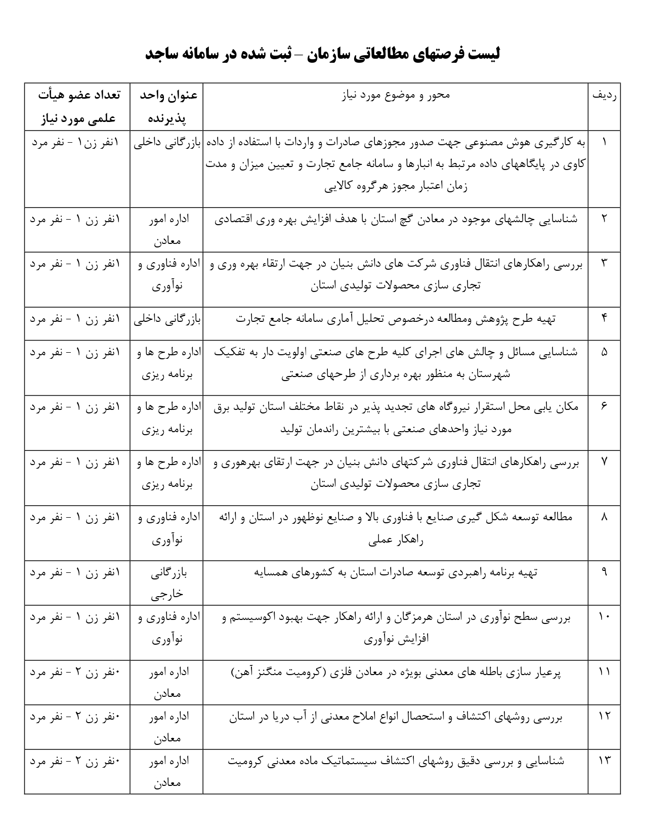 عطف به موافقت نامه همکاری فی مابین وزارت صمت و وزارت عتف و اختصاص سهمیه در قالب فرصت های مطالعاتی اعضای محترم هیات علمی دانشگاه ها برای دفاتر ستادی و ادارات کل استانی وزارت صنعت، معدن و تجارت عناوین فرصت های مطالعاتی مورد نظر سازمان مذکور که در سامانه ساجد نیز ثبت گردیده قابل بهره برداری می باشد.