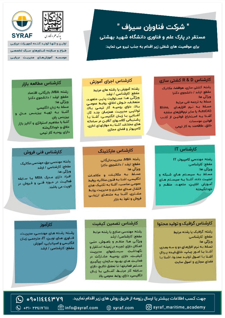 شرکت فناوری سیراف مستقر در پارک علم و فناوری دانشگاه شهید بهشتی برای موقعیت های شغلی زیر اقدام به جذب نیرو می نماید: