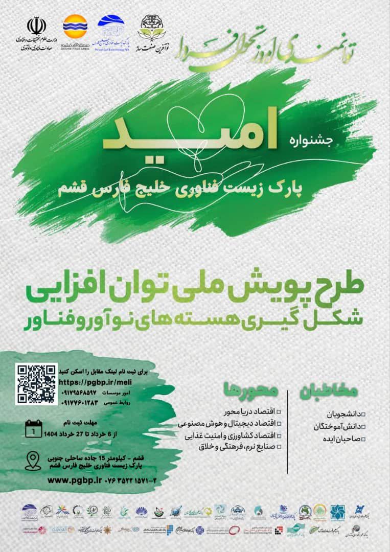 .فراخوان گام دوم جشنواره امید: طرح پویش ملی توان افزایی شکل گیری هسته های نوآور و فناور 💢 پارک زیست فناوری خلیج فارس قشم با همکاری وزارت علوم، تحقیقات و فناوری برگزار می نماید ❇️ فرصت ویژه برای پذیرش ایده و کسب مهارت های تخصصی و راه اندازی کسب و کار در حوزه های اقتصاد دریا محور،اقتصاد دیجیتال و هوش مصنوعی، اقتصاد کشاورزی و امنیت غذایی،صنایع نرم، فرهنگی و خلاق ✅ برنامه ها و حمایت ها: - پذیرش ایده - حضور در بوت کمپ ها و دوره های تخصصی - ارائه مشاوره - شبکه سازی و امکان ارتباط با سایر شرکتها - پذیرش تیم های مستعد در پارک زیست فناوری خليج فارس قشم - بهره مندی از بسته های حمایتی ویژه 📌 لینک ثبت نام https://pgbp.ir/meli ⭕️ مهلت ثبت نام: ۶ خرداد تا ۲۷ خرداد ۱۴۰۴ 🗓 زمان برگزاری افتتاحیه: ۱ تیر ماه ۱۴۰۴ 🏢 مکان برگزاری: پارک زیست فناوری خلیج فارس قشم 📞 راه های ارتباطی آقای مهندس چشمه نور: ۰۹۱۷۹۵۶۸۵۹۷ خانم جعفری: ۰۹۱۷۷۶۰۱۲۸۳ ۰۷۶۳۵۲۲۱۵۷۱-۲ 🌀 https://chat.whatsapp.com/JPpz2MgCUx24cVnEXgKlWt https://eitaa.com/Qeshmpgbp