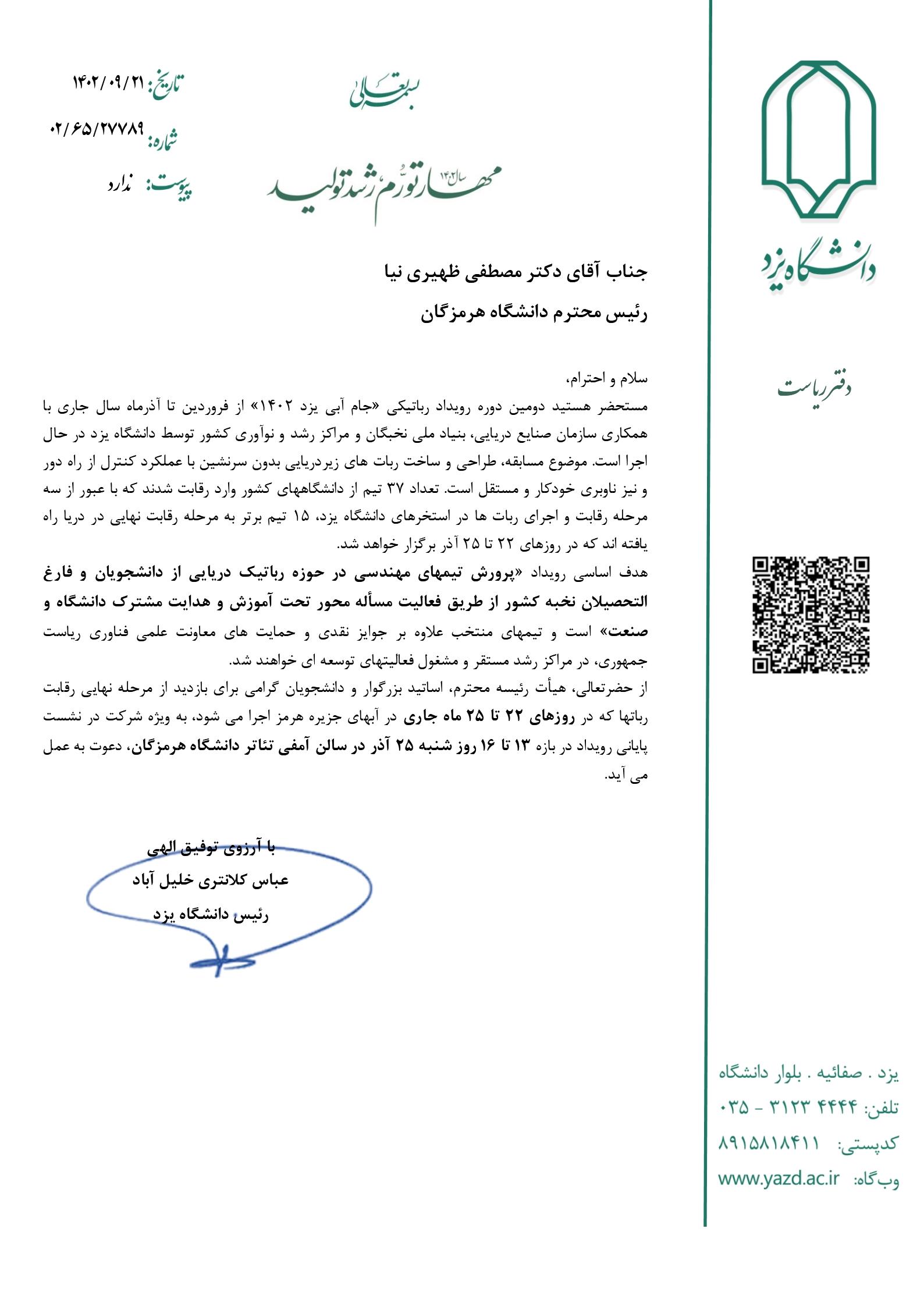 نشست پایانی دومین دوره رویداد رباتیکی جام آبی یزد 1402 در سالن آمفی تاتر دانشگاه هرمزگان
