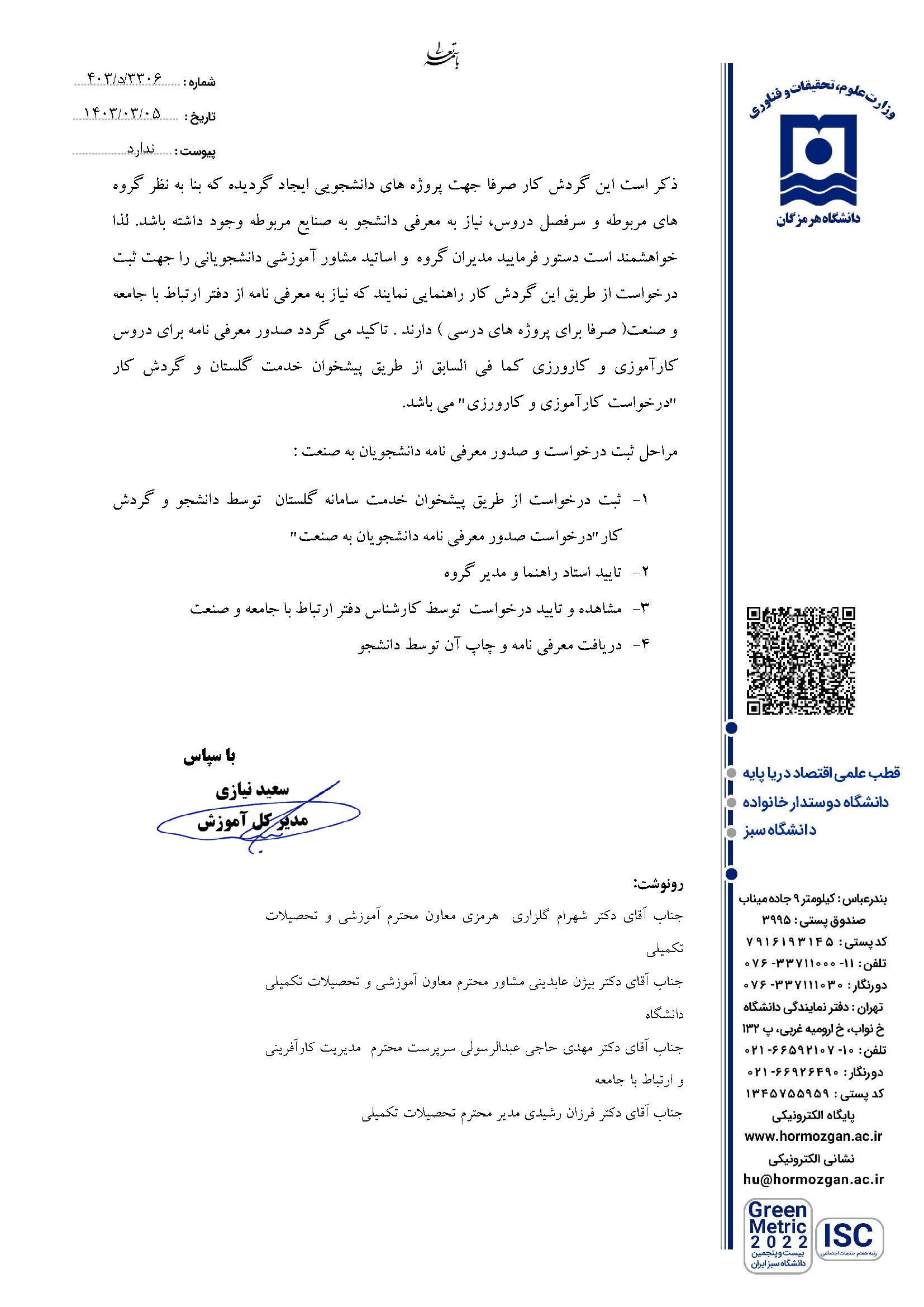 تسهیل روند صدور معرفی نامه دانشجویان به صنعت در انجام پروژه های درسی