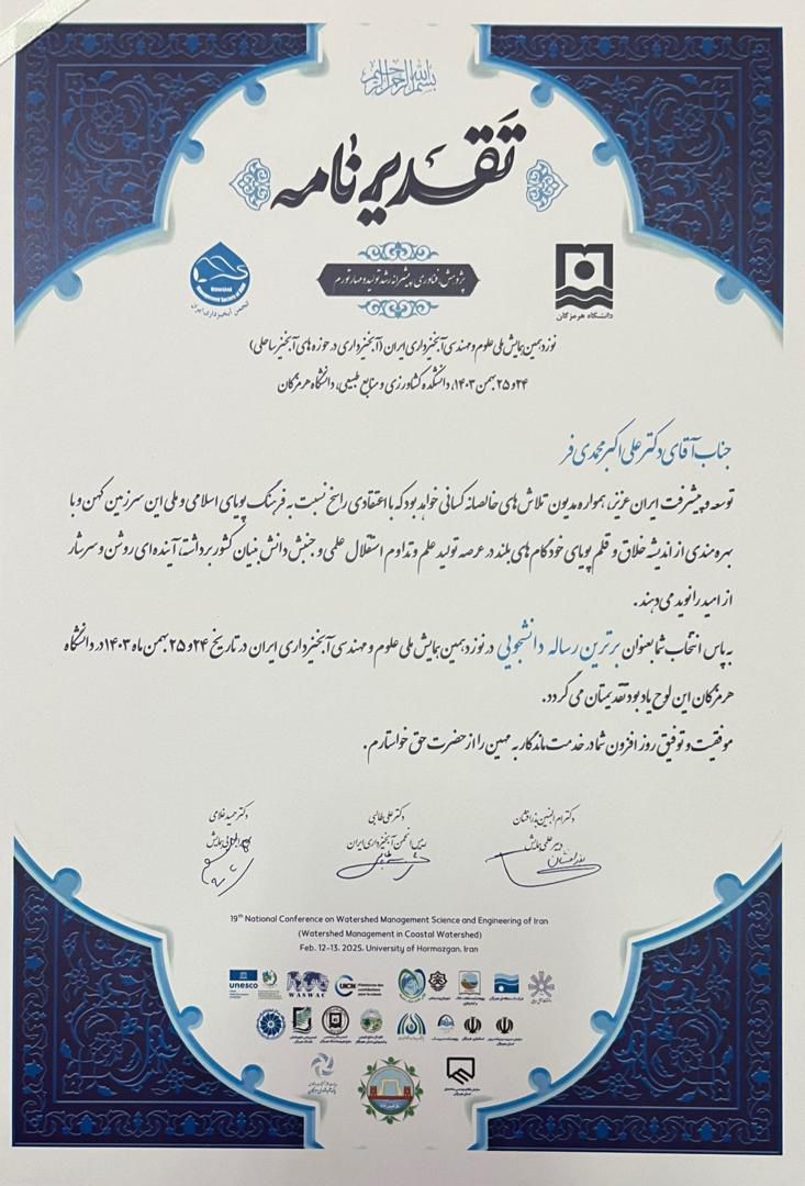 انتخاب رساله اقای علی اکبر محمدی فر دانش آموخته رشته دکتری علوم و مهندسی آبخیزداری به عنوان یکی از دو رساله برتر در نوزدهمین همایش ملی علوم و مهندسی آبخیزداری ایران