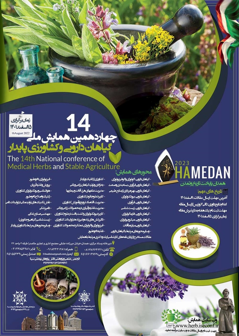 چهاردهمین همایش ملی گیاهان دارویی وکشاورزی پایدار روز دوشنبه، 15 اسفند، 1401 توسط انجمن علمی و پژوهشی دانش پژوهان بوعلی سینا و تحت حمایت سیویلیکا در شهر همدان برگزار می شود.با توجه به اینکه این همایش به صورت رسمی برگزار می گردد، کلیه مقالات این کنفرانس در پایگاه سیویلیکا و نیز کنسرسیوم محتوای ملی نمایه خواهد شد و شما می توانید با اطمینان کامل، مقالات خود را در این همایش ارائه نموده و از امتیازات علمی ارائه مقاله کنفرانس با دریافت گواهی کنفرانس استفاده نمایید.