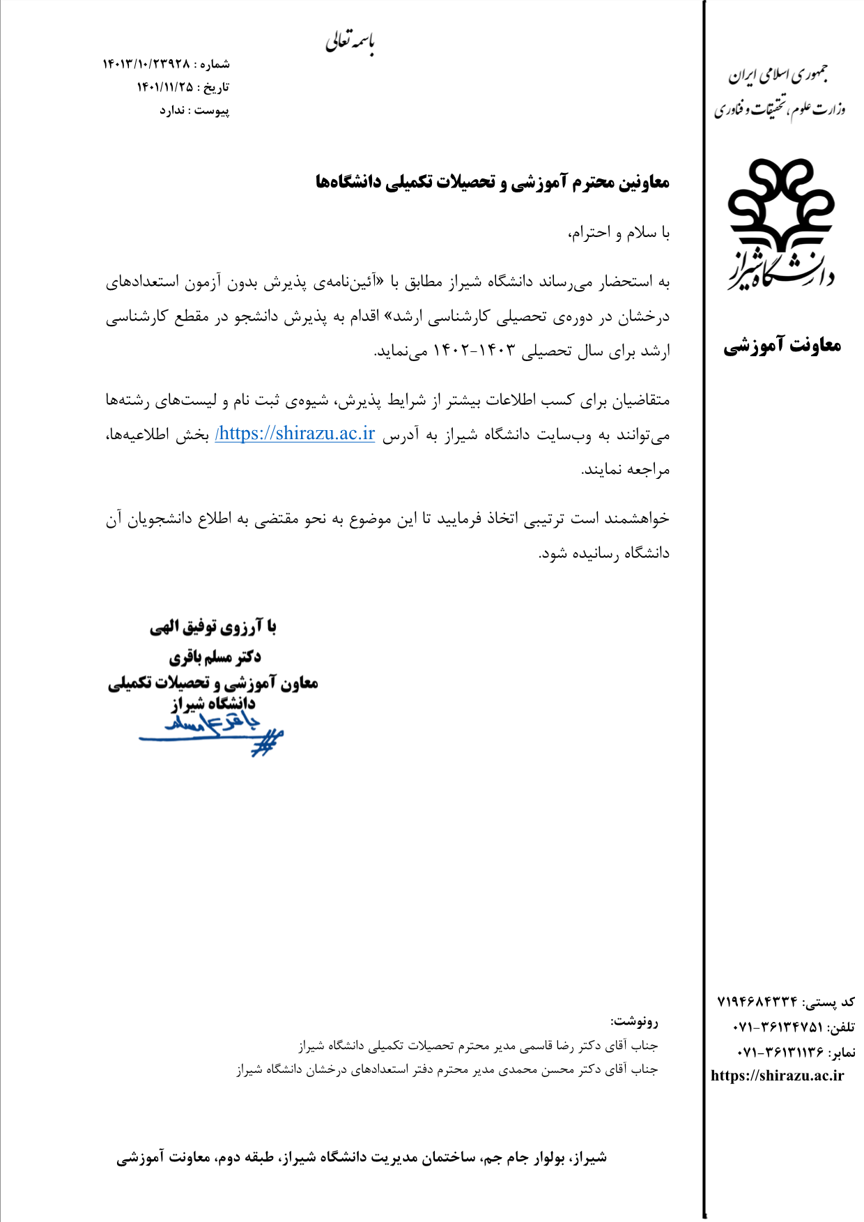 پذیرش بدون آزمون استعدادهای درخشان در دوره تحصیلی کارشناسی ارشد توسط دانشگاه شیراز برای سال تحصیلی 1403-1402