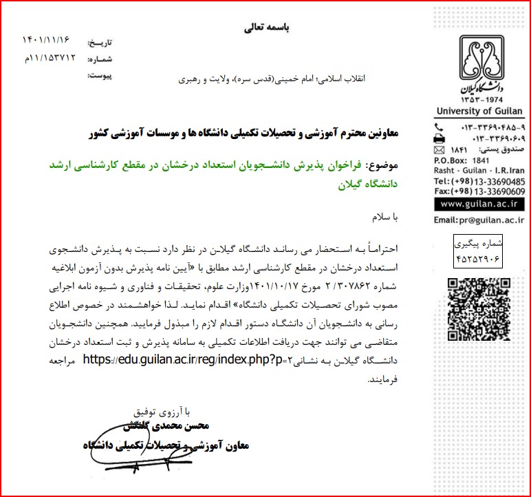 فراخوان پذیرش دانشجو به شیوه بدون آزمون در (استعداد درخشان) برای سال تحصیلی4031-1402دانشگاه گیلان