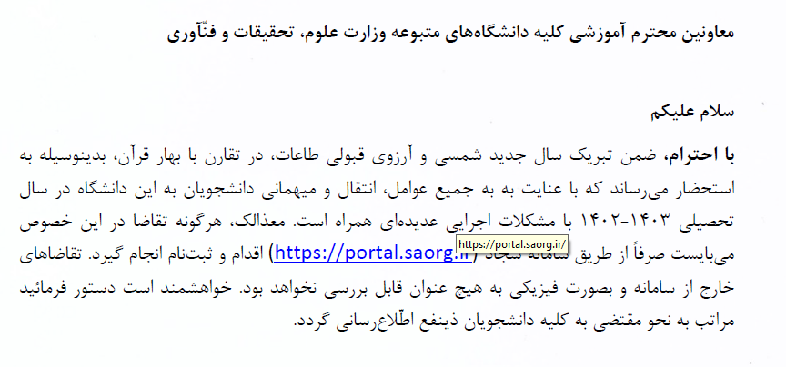 ه استحضار می رساند : دانشجویان متقاضی مهمانی و یا انتقالی صرفاً در اردیبهشت هر سال می توانند از طریق سامانه سجاد نسبت به ثبت درخواست خود اقدام نمایند. (https://portal.saorg.ir)
