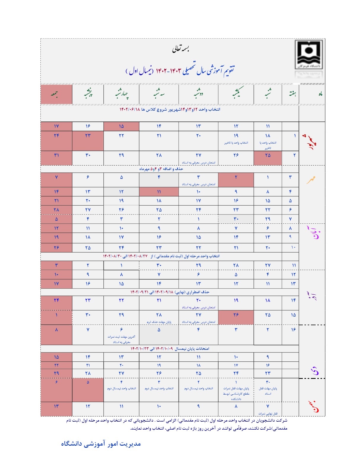 تقویم آموزشی نیمسال تحصیلی اول1403-1402