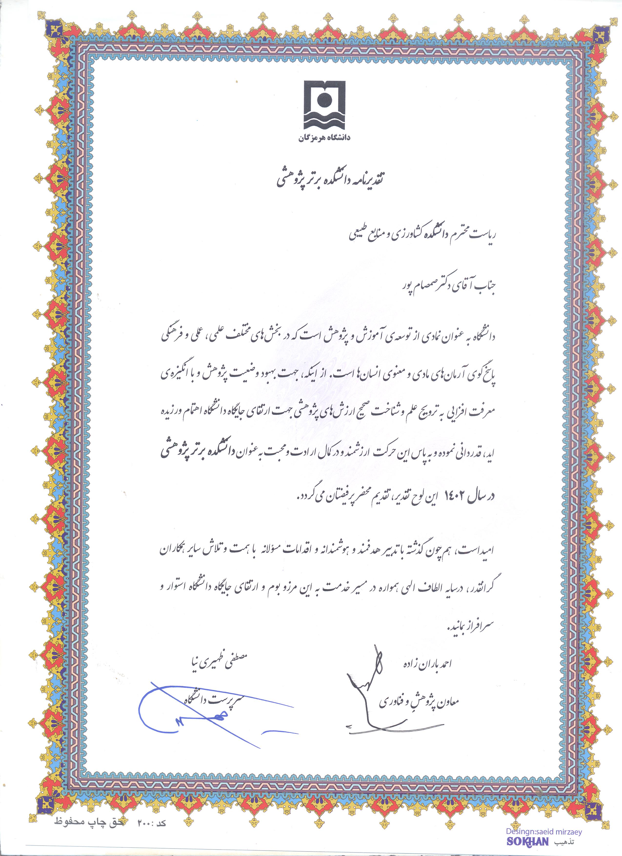 تقدیرنامه پژوهشی