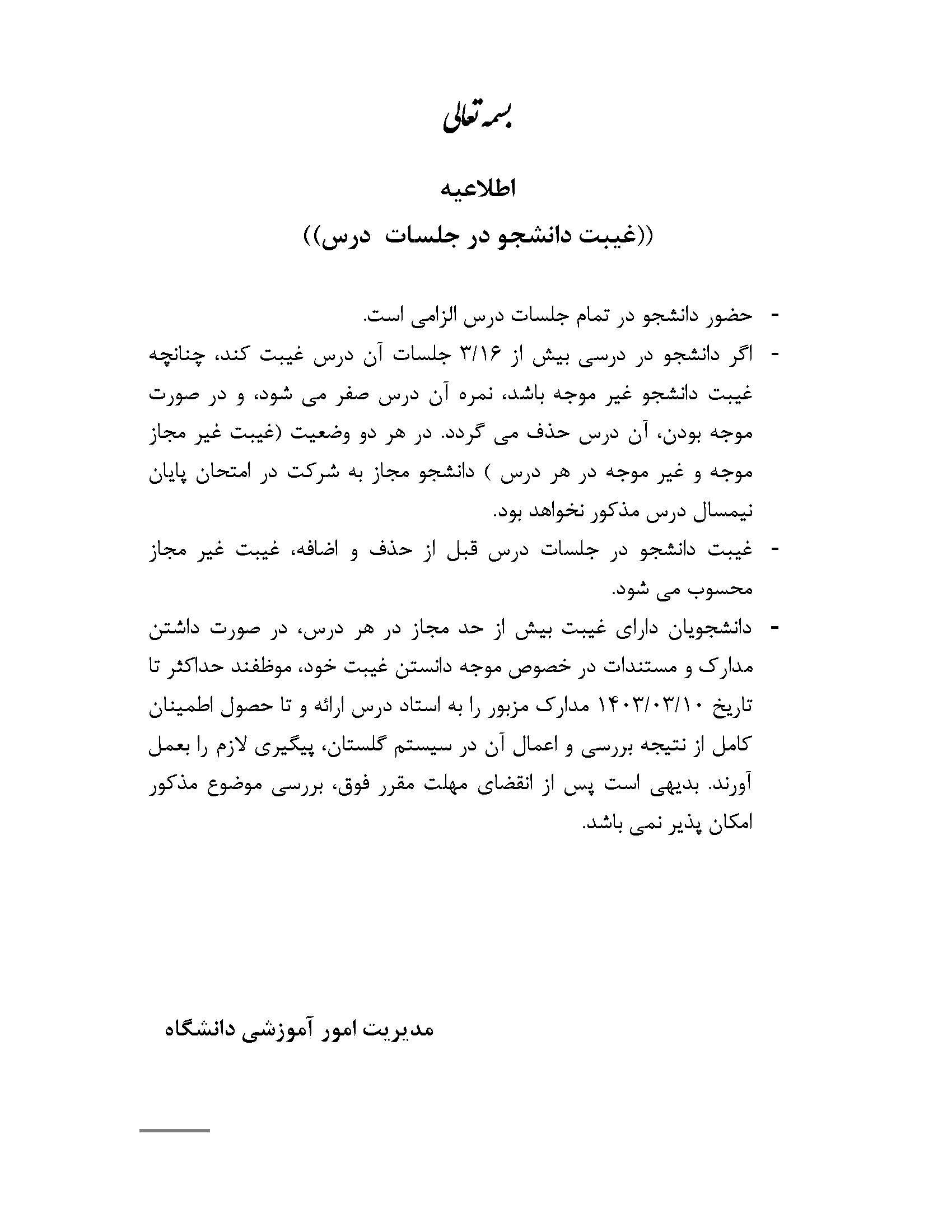 حضور دانشجو در تمام جلسات درس الزامی است. - اگر دانشجو در درسی بیش از 3/16 جلسات آن درس غیبت کند، چنانچه غیبت دانشجو غیر موجه باشد، نمره آن درس صفر می شود، و در صورت موجه بودن، آن درس حذف می گردد. در هر دو وضعیت (غیبت غیر مجاز موجه و غیر موجه در هر درس ) دانشجو مجاز به شرکت در امتحان پایان نیمسال درس مذکور نخواهد بود.