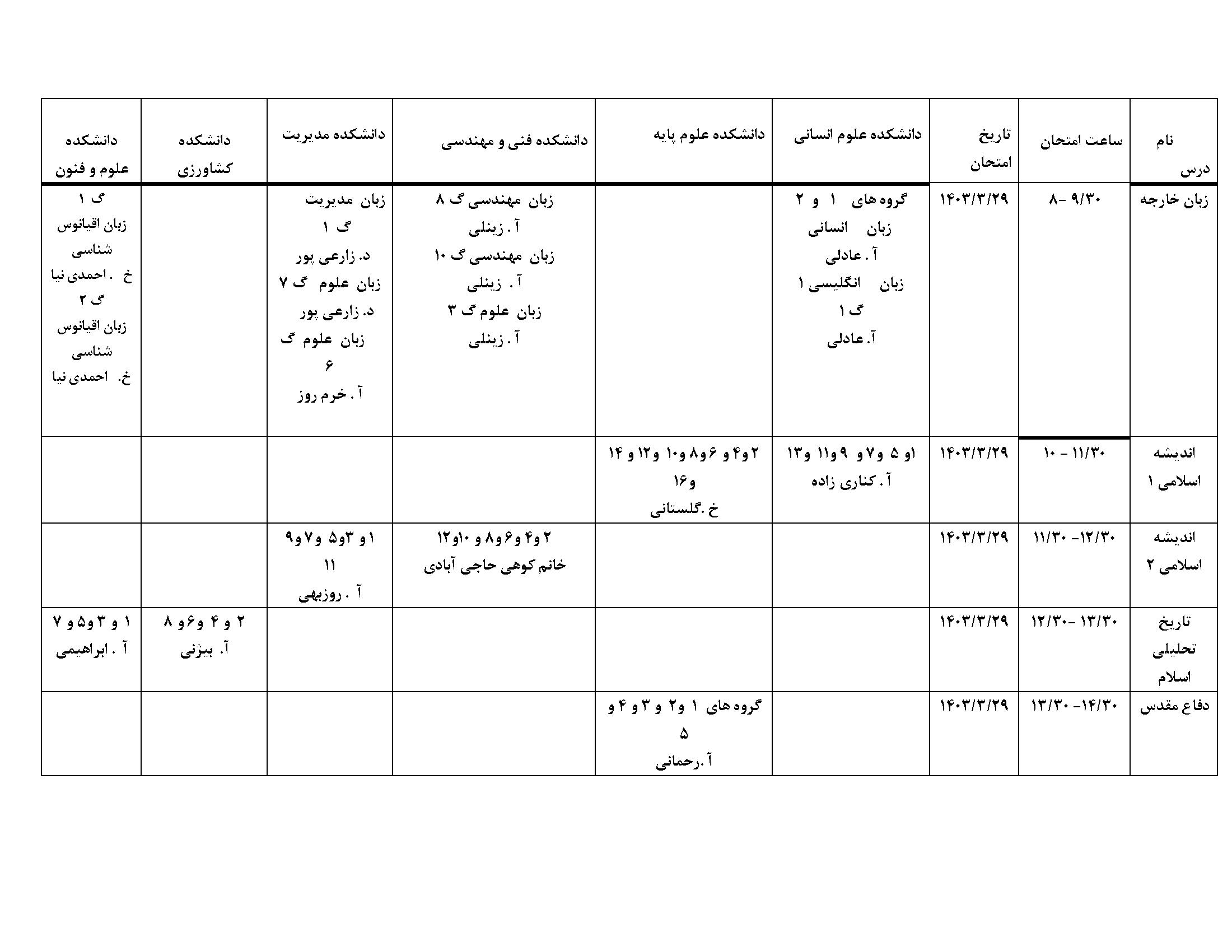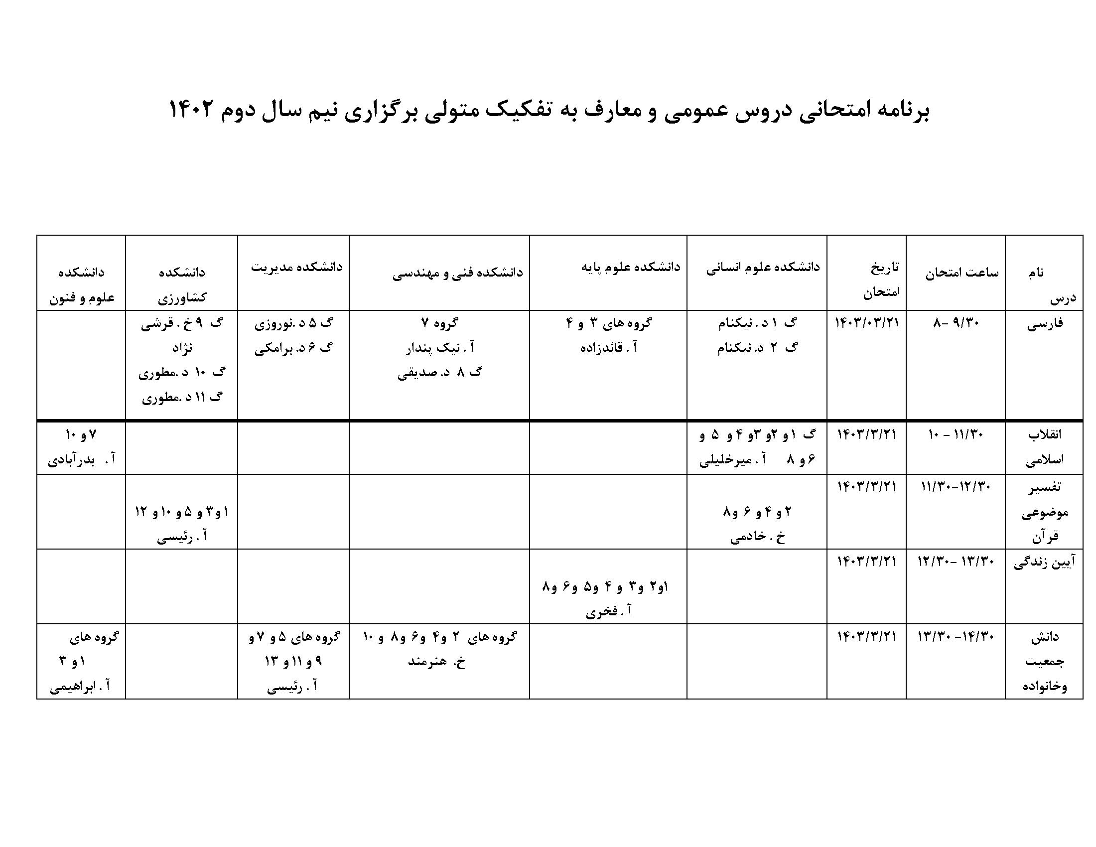 برنامه امتحانی دروس عمومی و معارف به تفکیک متولی برگزاری نیم سال دوم 1402
