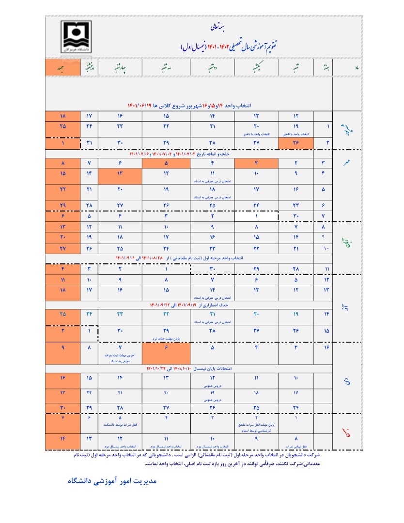 تقویم آموزشی سال تحصیلی1402-1401(نیمسال اول)