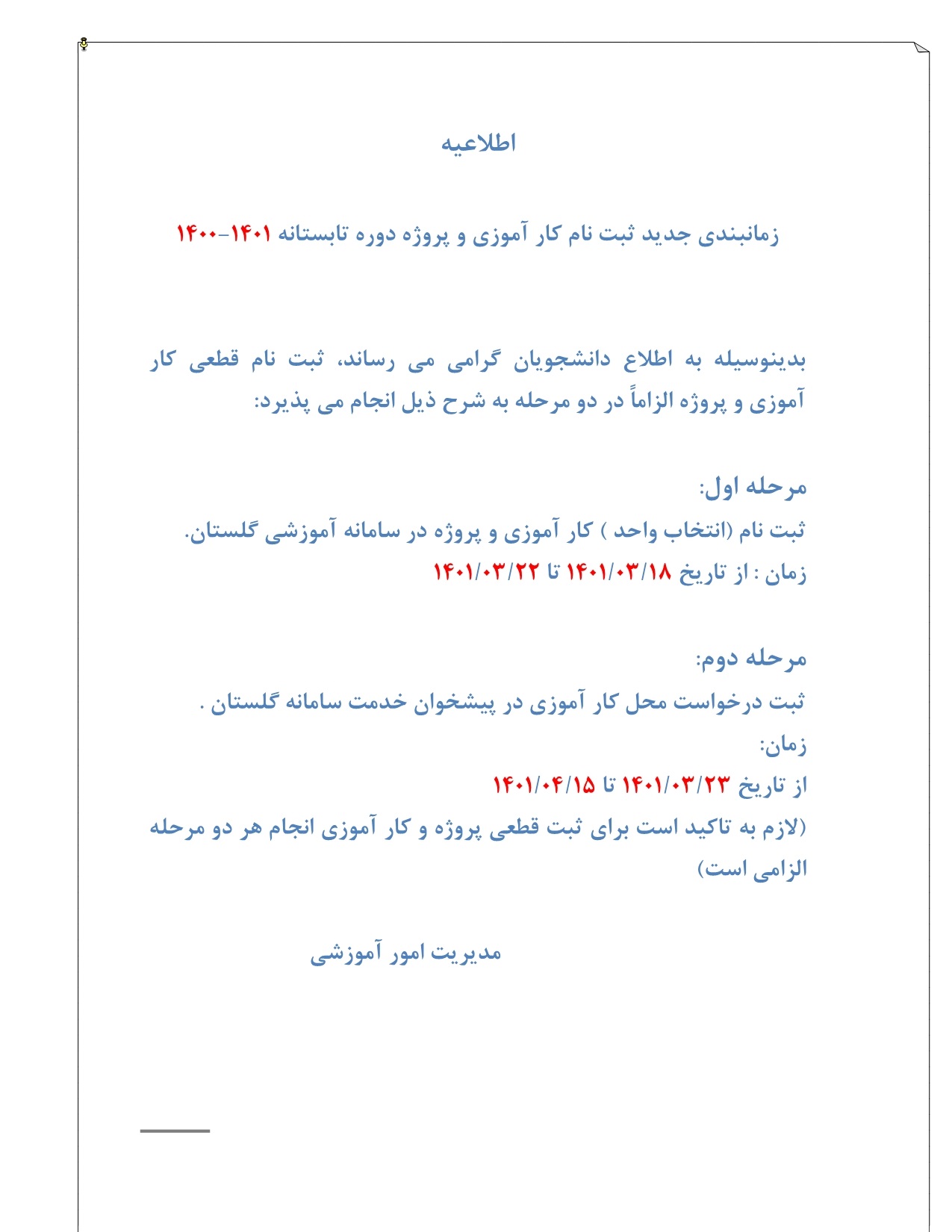 جدول زمان بندی پروژه و کارآموزی تابستان1401
