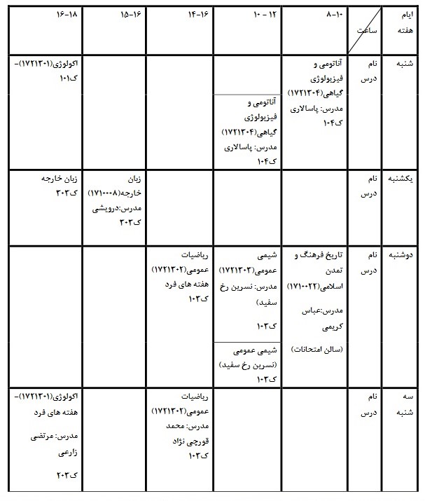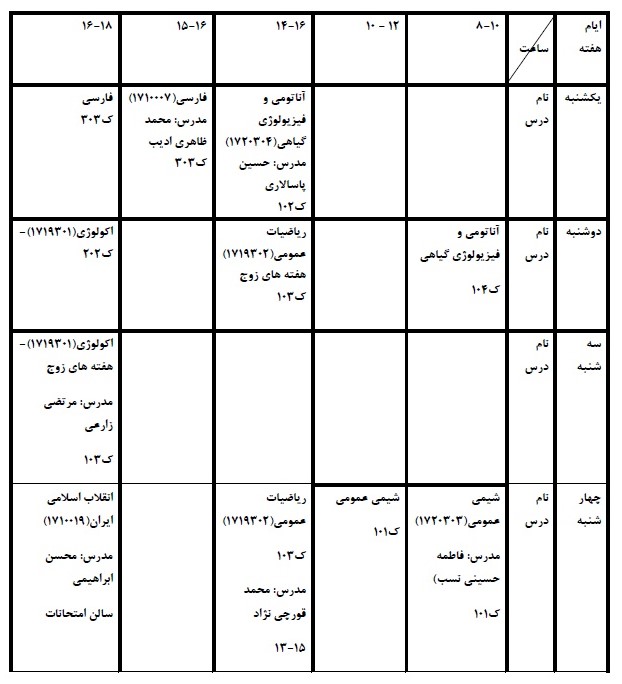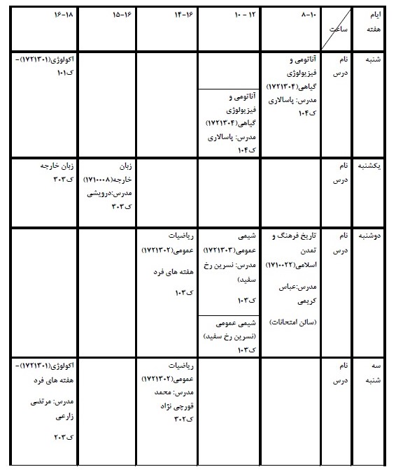 (راهنمای محل کلاس ها: کلاس های 101، 102، 103 و 104 واقع در طبقه همکف دانشکده کشاورزی، کلاس های 201، 202 و 203 واقع در طبقه اول دانشکده کشاورزی و کلاس های 301، 302، 303 و کارگاه کامپیوتر واقع در دانشکده مهندسی - ساختمان حاسب هرمزی می باشد).