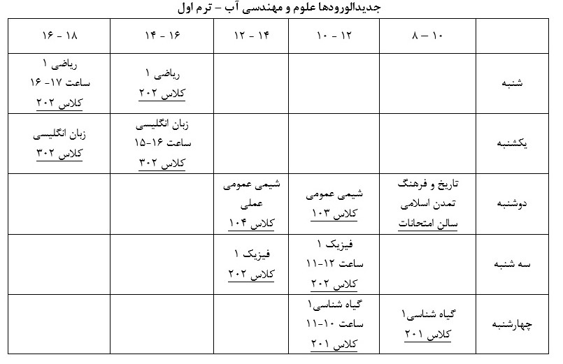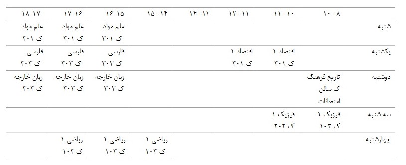 ضمن تبریک به دانشجویان جدید الورود جهت قبولی در دانشگاه، برنامه ی هفتگی درسی مطابق جداول زیر می باشد. ضمنا محل تشکیل هر کلاس در برنامه قید شده است.