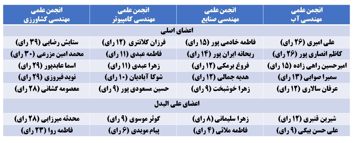 انتخابات انجمن های علمی مجتمع آموزش عالی میناب با مشارکت دانشجویان در تاریخ یکشنبه 30 اردیبهشت ماه برگزار گردید که نتایج آراء بدست آمده به شرح زیر است.