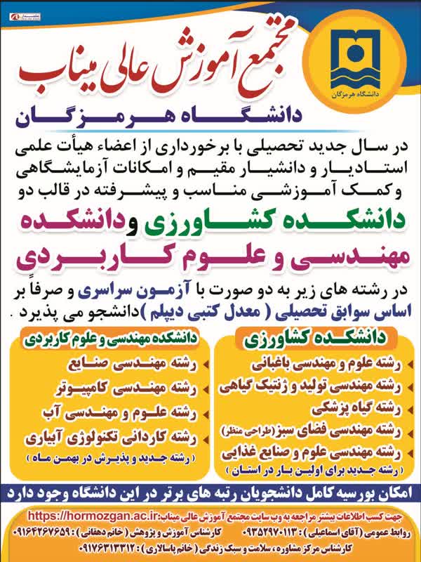 جهت کسب آخرین اخبار و اطلاعیه ها و همچنین آشنایی با امکانات مجتمع آموزش عالی میناب - دانشگاه هرمزگان، به وبسایت مجتمع مراجعه فرمایید:
