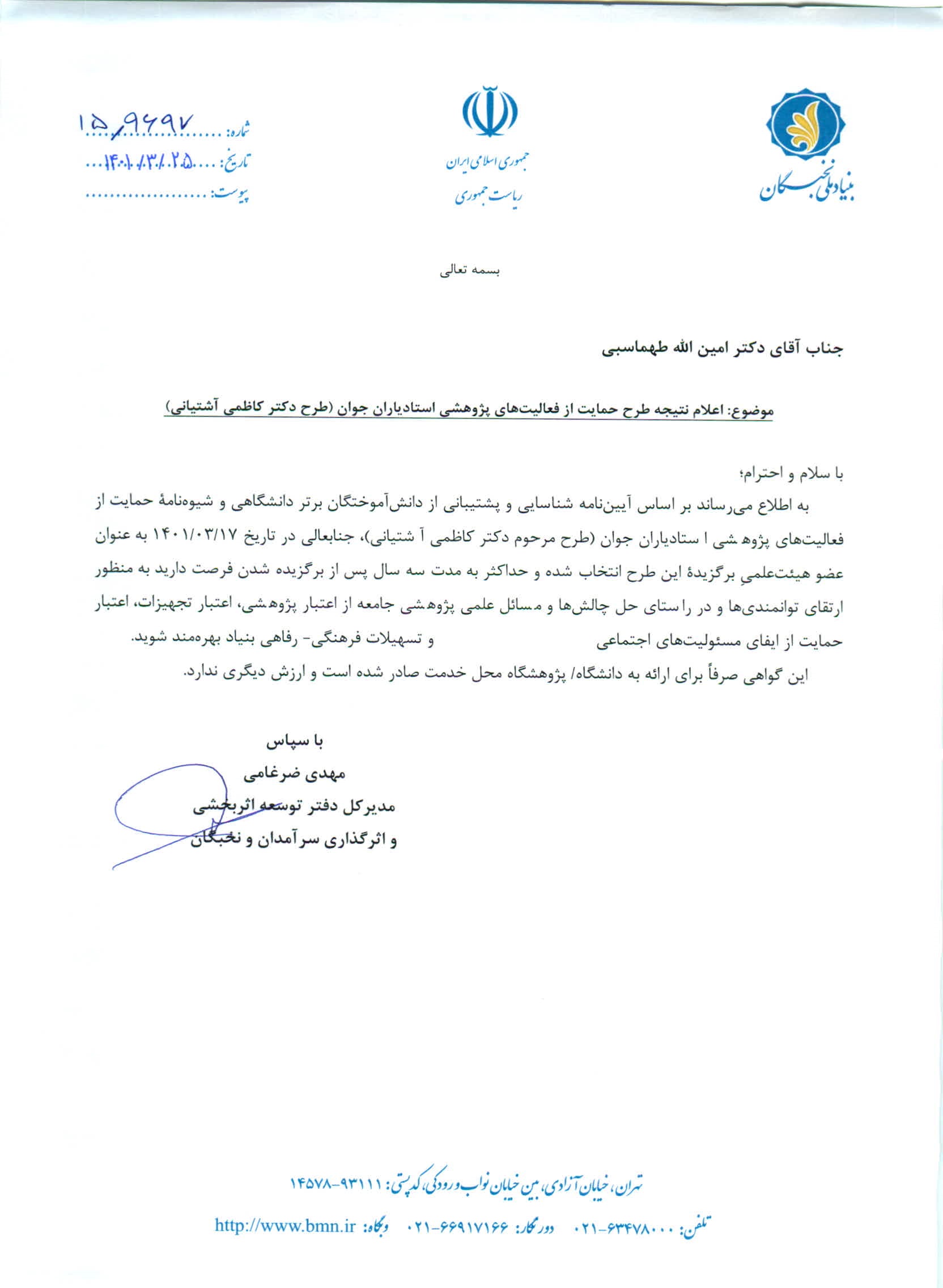 «بر اساس آیین نامه شناسایی و پشتیبانی از دانش آموختگان برتر دانشگاهی و شیوه نامه ی حمایت از فعالیت های پژوهشی استادیاران جوان (طرح مرحوم دکتر آشتیانی)، جنابعالی در تاریخ 1401/3/17 به عنوان عضو هیئت علمی برگزیده ی این طرح انتخاب شده و حداکثر به مدت سه سال پس از برگزیده شدن فرصت دارید به منظور ارتقای توامندی ها و در راستای حل چالش ها و مسائل علمی پژوهشی جامعه از اعتبار پژوهشی، اعتبار تجهیزات، اعتبار حمایت از ایفای مسئولیت اجتماعی و تسهیلات فرهنگی-رفاهی بنیاد بهره مند شوید».